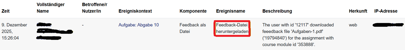 Zudem wird Protokolliert ob eine Feedback-Datei bereits heruntergeladen wurde. Damit sehen Sie auf den ersten Blick ob ihre Teilnehmer ihr Feedback eingesehen haben.