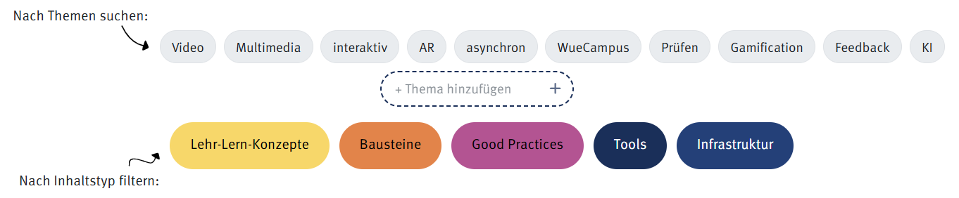 Die Einträge in der Toolbox sind mit Schlagworten versehen. Du kannst Einträge durch Deine Eingabe in das Suchfeld oder durch Auswahl der angezeigten Schlagworte (nach Themen suchen) finden. Zusätzlich kannst Du dich in den verschiedenen Bereichen (nach Inhaltstypen filtern) der Toolbox umschauen.