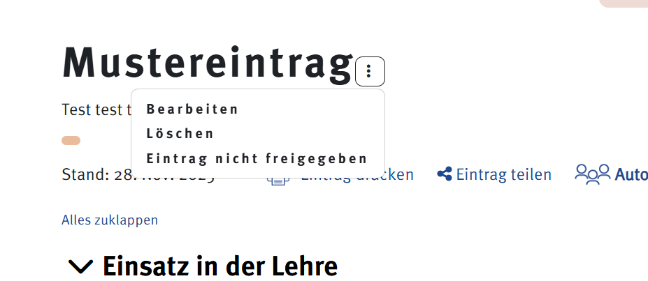 Um Deinen Beitrag zu löschen, gehe auf die Einzelansicht Deines Eintrags. Neben dem Titel findest Du drei Punkte, mit der Option "Löschen". Es öffnet sich ein Fenster, in welchem du bestätigen musst, dass Du Deinen Beitrag löschen möchtest.