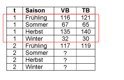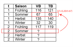 Um den Bedarf der Saison "Sommer" in der 2. Periode zu berechnen, wird auf die Bedarfsdaten der Saison "Sommer" in der Periode 1 zurückgegriffen. Die dazwischenliegenden Bedarfsdaten werden nicht berücksichtigt.