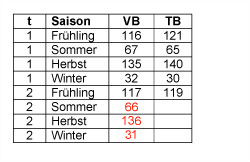 Besteht eine Periode aus 4 Abschnitten (Sommer, Herbst, Winter. Frühling), so existieren 4 verschiedene Reihen von Bedarfsdaten. Diese werden zur Berechnung der entsprechenden Saison herangezogen.