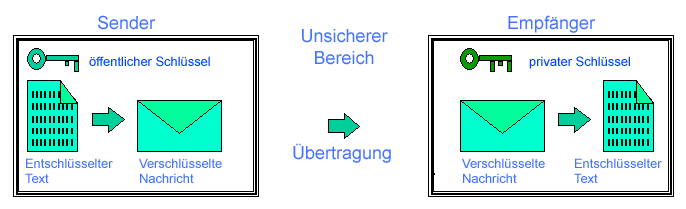 . So besitzt nun der Empfänger einen privaten Schlüssel, der nur ihm bekannt ist und einen öffentlichen, der jedem zugänglich ist. Der Sender kodiert nun die Nachricht mit dem öffentlichen Schlüssel des Empfängers. Die so verschlüsselte Nachricht kann jedoch nur mit dem privaten Schlüssel entschlüsselt werden. Durch dieses System kann der Empfänger ohne Risiko seinen öffentlichen Schlüssel an alle Kommunikationspartner ungesichert versenden. Die asymmetrischen Verschlüsselungsverfahren benötigen jedoch wesentlich mehr Rechenleistung als symmetrische Verfahren.